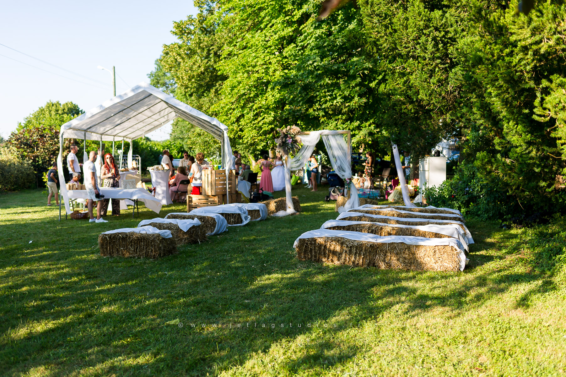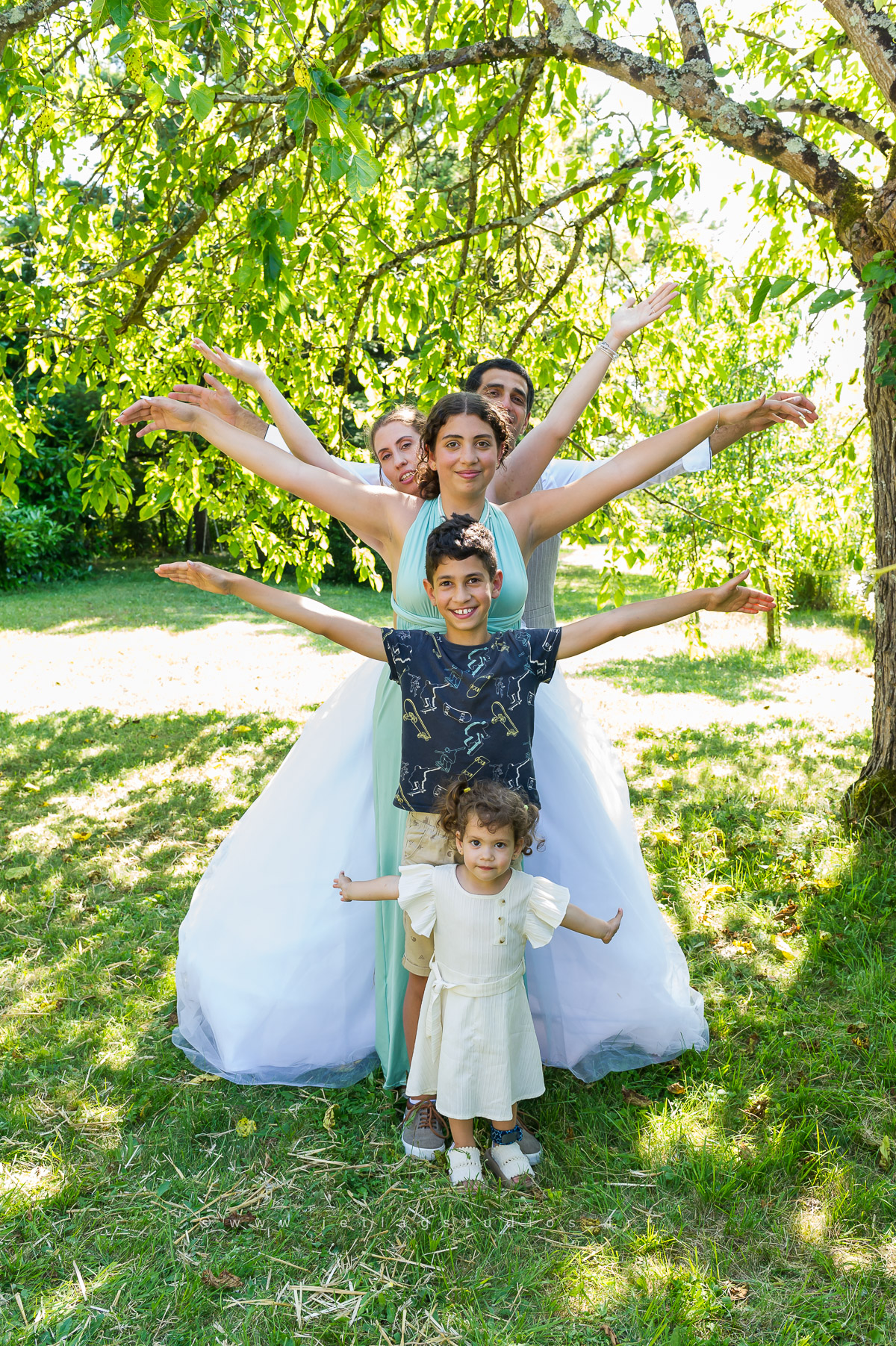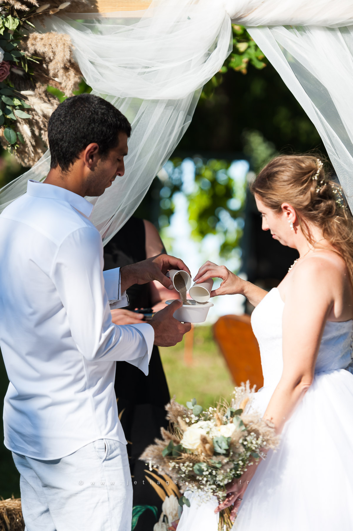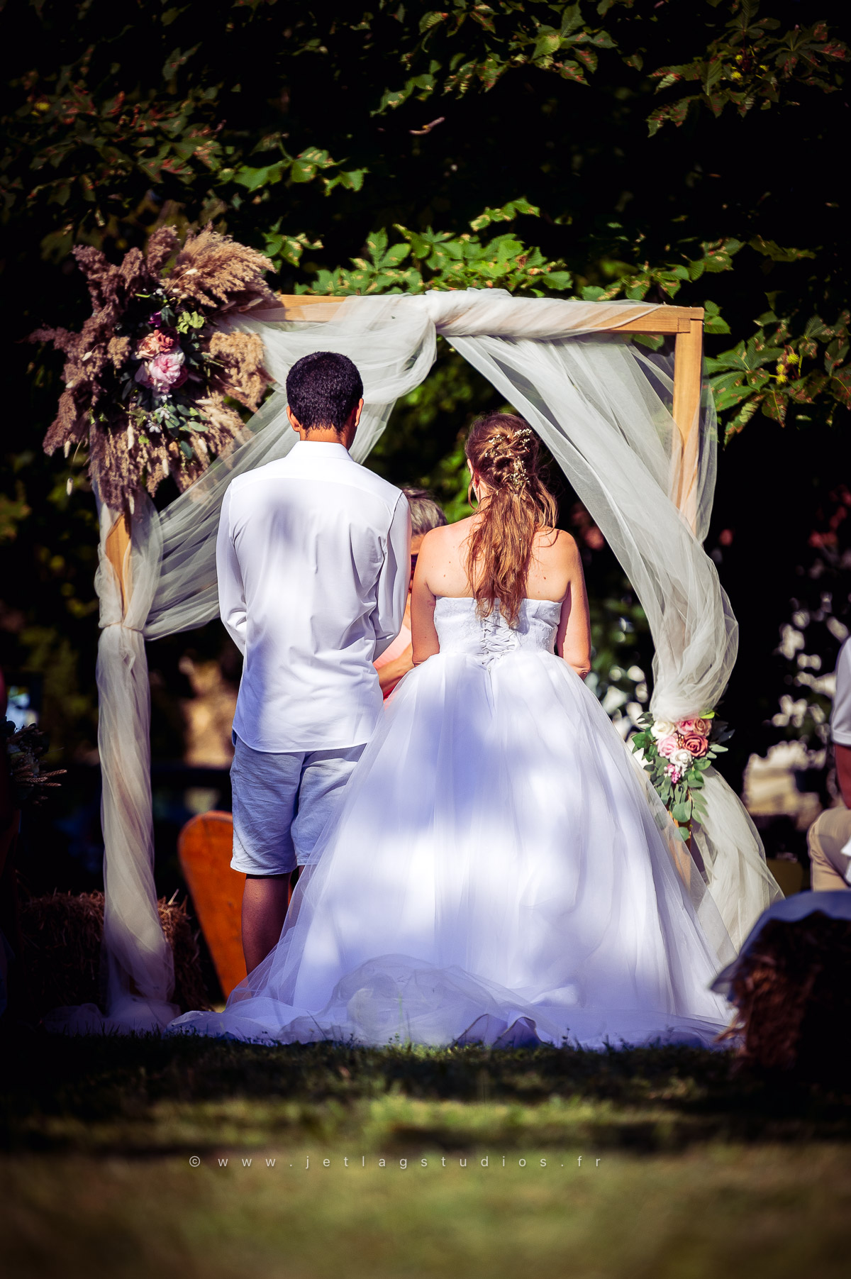 Un joli “oui” à la mairie de Villieu, puis direction une propriété privée arborée pour le reste de la journée : photos de couple à l’ombre des arbres, cérémonie laïque pleine d’émotions, photos de groupes décontractées, et un goûter/vin d’honneur convivial sous le signe de la bonne humeur.
