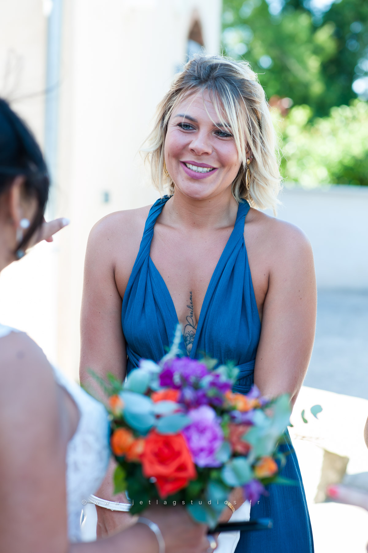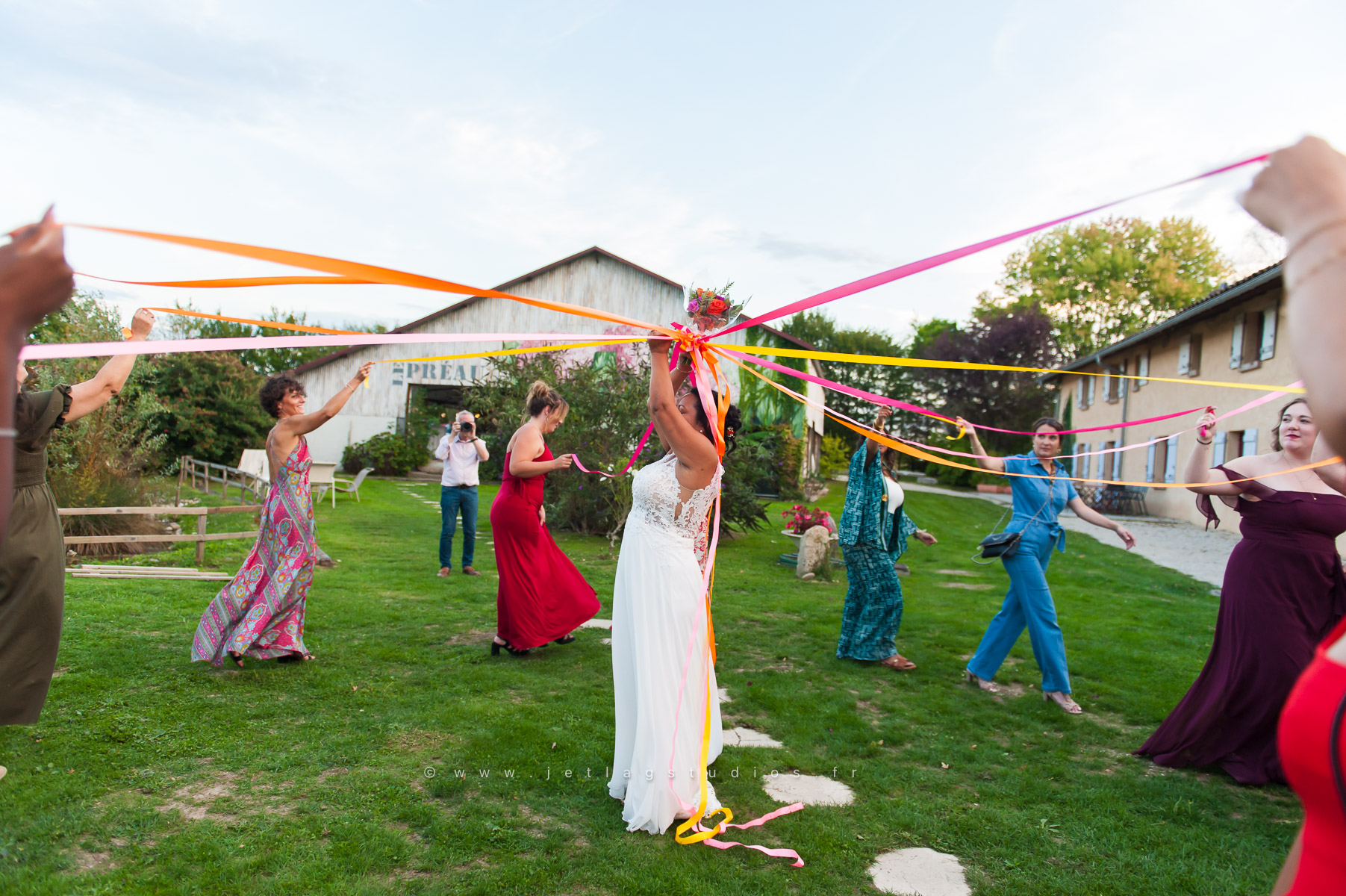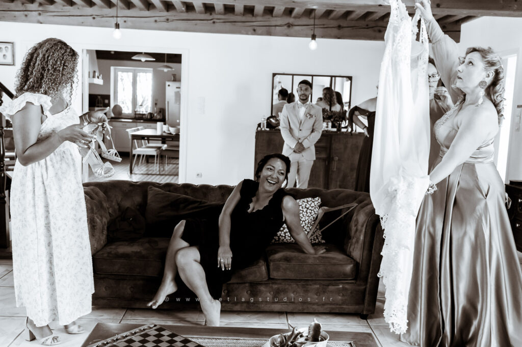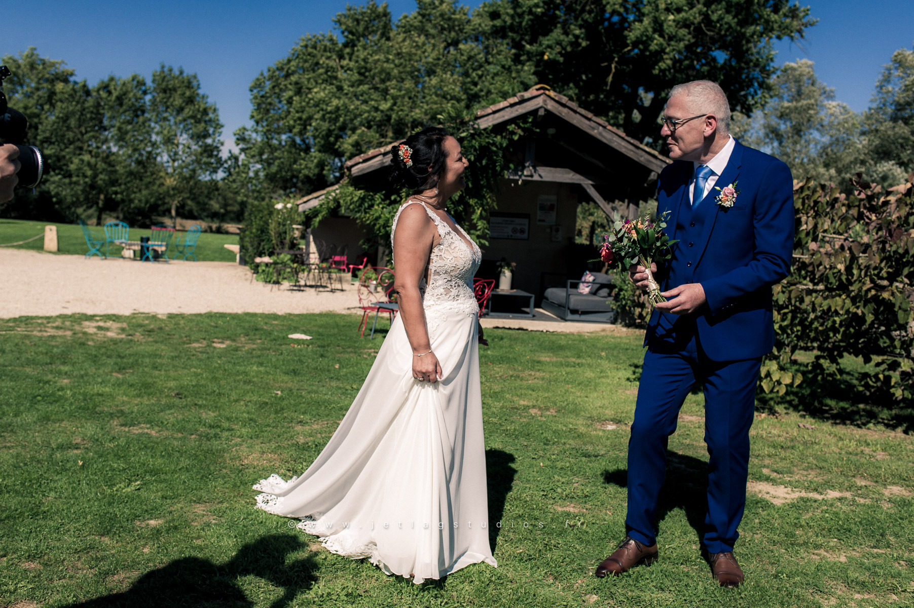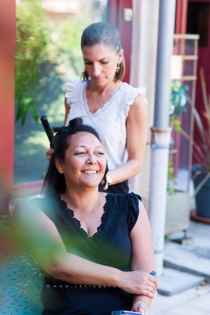 Les préparatifs se font en extérieur, sans chichi, tel un moment de partage avec les familles proches déjà sur place. On enfile la robe et le costume, la tension monte, mais la bonne humeur est toujours bien là ! Nous faisons route pour Montluel, ou l’adjointe recueillera les « oui » de rigueur, et où nous avons profité du petit lavoir pour faire nos photos de groupes. Il ne faut pas trop que cela traine, Sandrine veut passer à la suite.