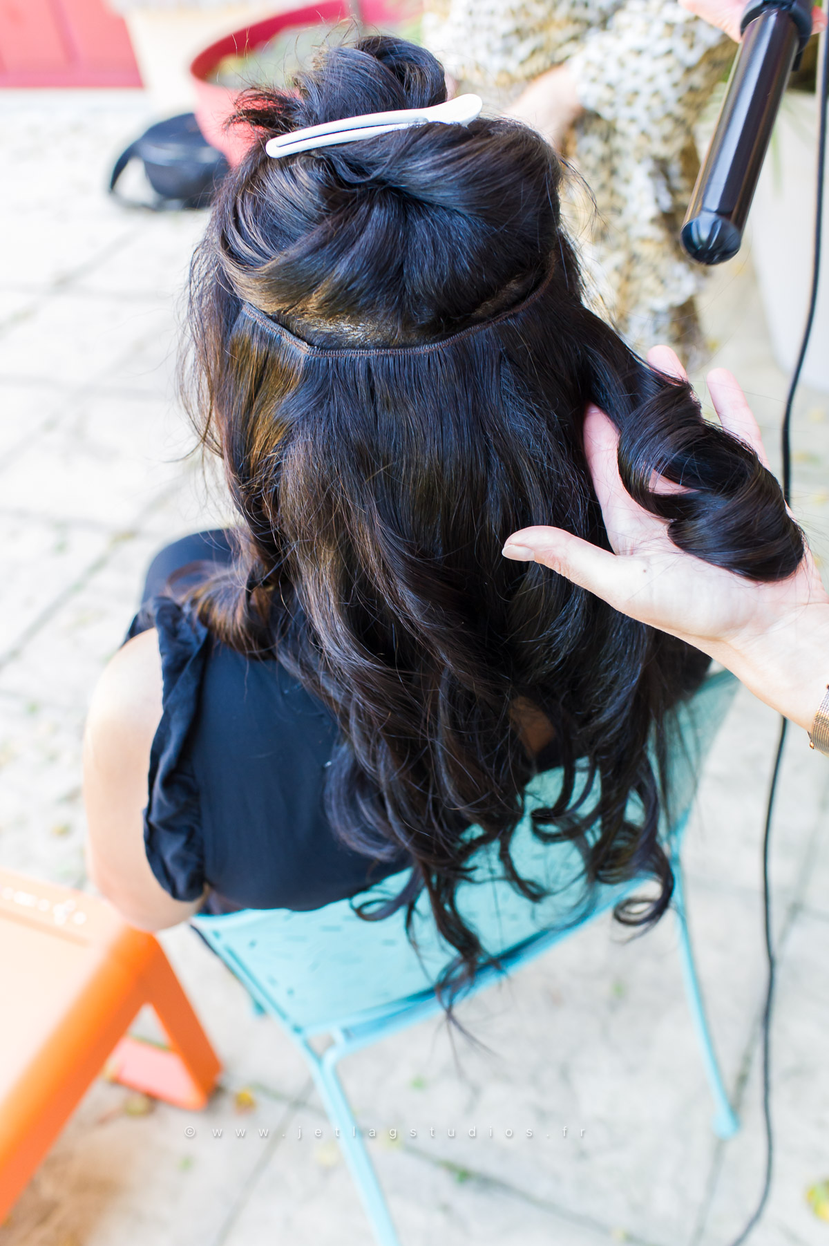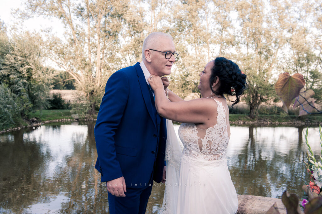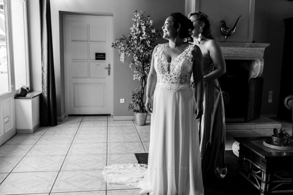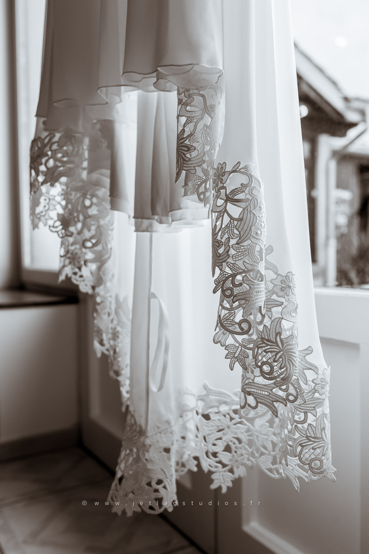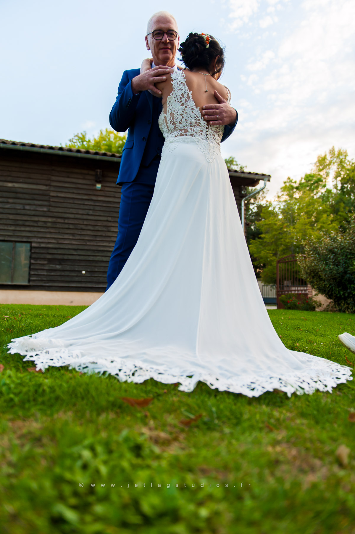 Les préparatifs se font en extérieur, sans chichi, tel un moment de partage avec les familles proches déjà sur place. On enfile la robe et le costume, la tension monte, mais la bonne humeur est toujours bien là ! Nous faisons route pour Montluel, ou l’adjointe recueillera les « oui » de rigueur, et où nous avons profité du petit lavoir pour faire nos photos de groupes. Il ne faut pas trop que cela traine, Sandrine veut passer à la suite.