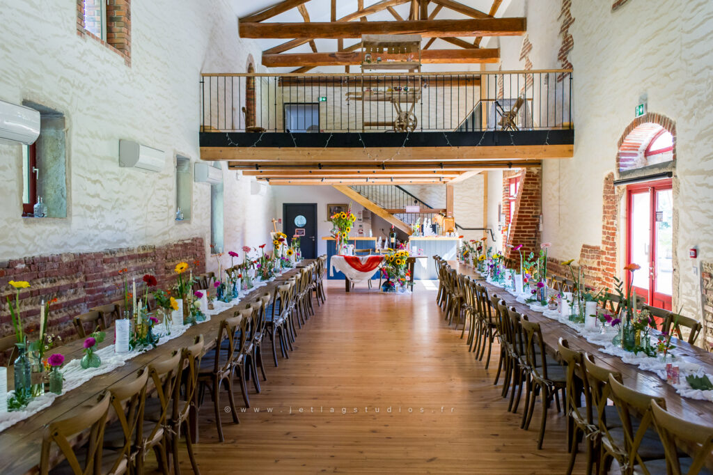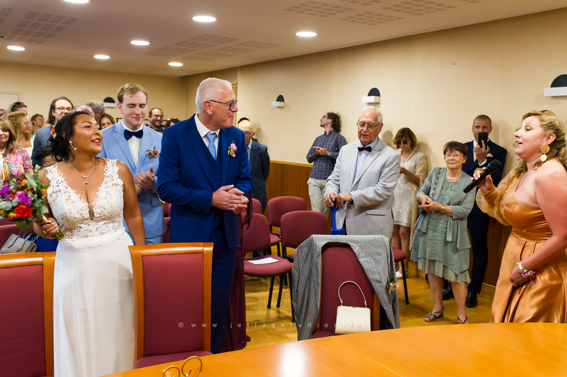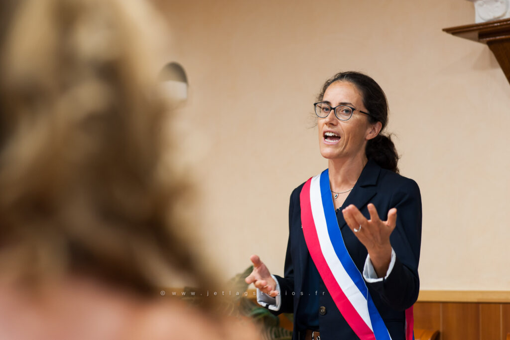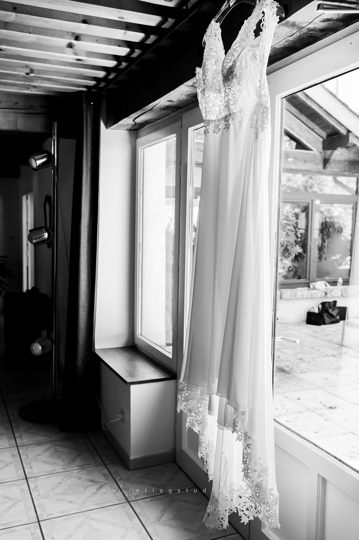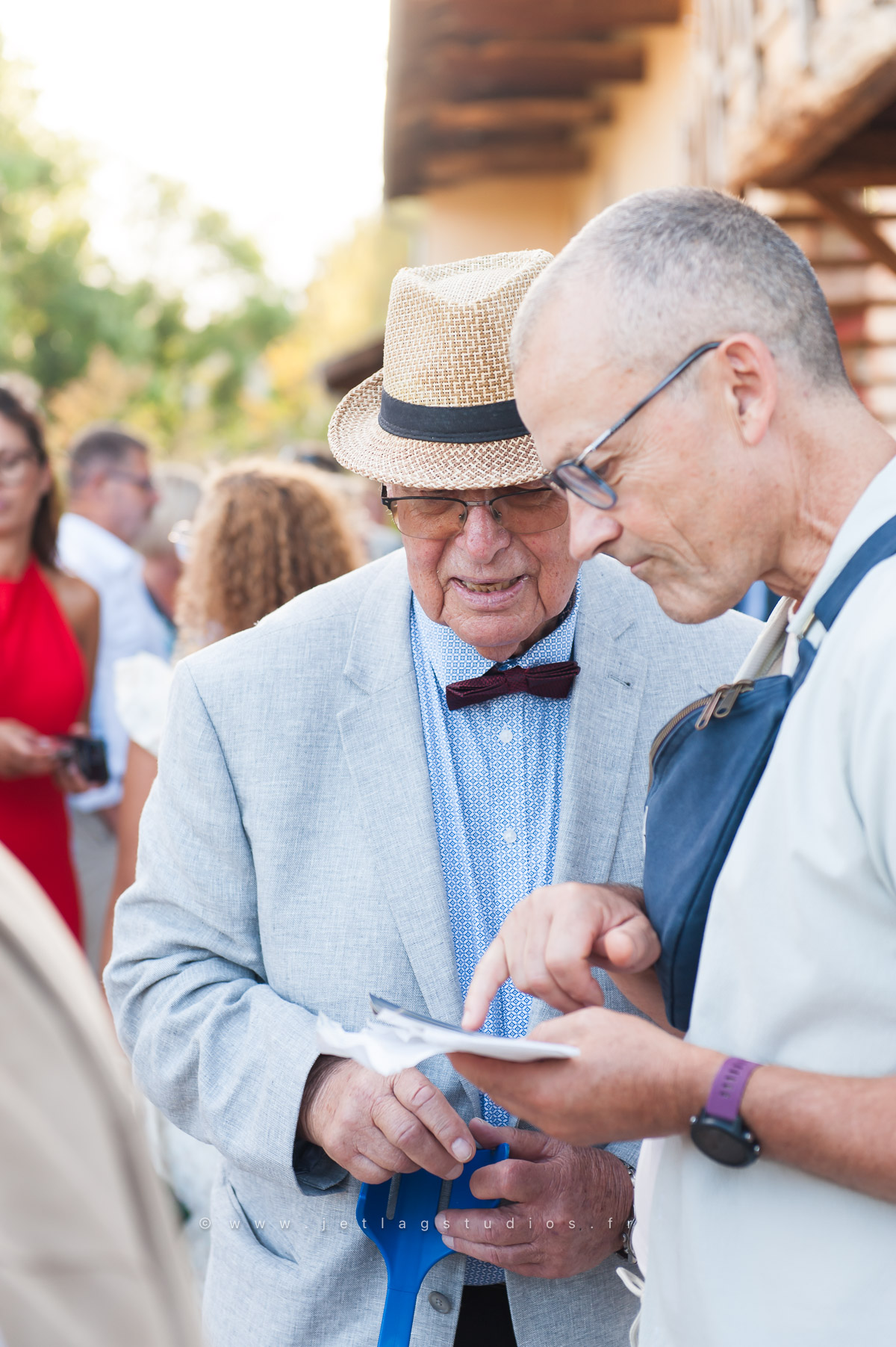 Les préparatifs se font en extérieur, sans chichi, tel un moment de partage avec les familles proches déjà sur place. On enfile la robe et le costume, la tension monte, mais la bonne humeur est toujours bien là ! Nous faisons route pour Montluel, ou l’adjointe recueillera les « oui » de rigueur, et où nous avons profité du petit lavoir pour faire nos photos de groupes. Il ne faut pas trop que cela traine, Sandrine veut passer à la suite.